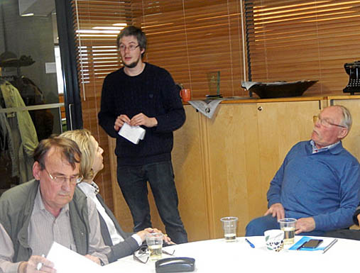 Efter årsmötet hade vi besök av Fredrik Sonck, som sedan september 2014 är chef för KSF-medias sammanslagna kulturredaktion. Han berättade bland annat att redaktionens tre delar – VN, HBL och ÖN – kan agera som självständiga beställare. Det betyder att finlandssvensk litteratur och teater fortfarande kan uppmärksammas med tre olika recensioner. På så sätt vill redaktionsledningen trygga en fortsatt mångstämmighet.