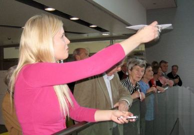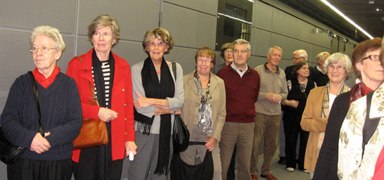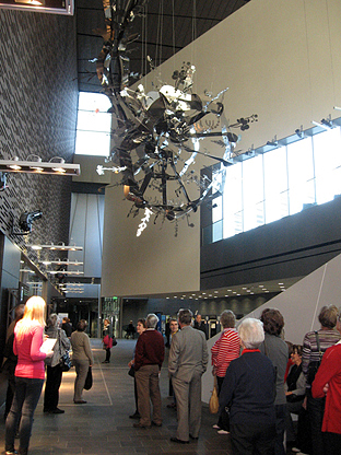 Vidare till Sibeliusakademins utrymmen med en hög aula och en snygg röd "suckarnas bro". Vid huvudingången beundrades det 14 meter höga konstverket Jordens gudinna i rostfritt stål. I husets nedre regioner fick vi se Sonora, en av de fem mindre konsertsalarna. Besöket avslutades med kaffe i aulan där fönsterväggarna öppnar sig mot Kiasma, Sanomahuset och resterna av de brandhärjade magasinen. (MBP)