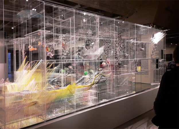 Där guidades vi av museilektor Pernilla Wiik som inte bara berättade om konstverken vi såg utan också provocerade oss att själva försöka uttrycka våra intryck. "På jakt efter nutiden" är en utställning där väldigt olika verk av 22 olika konstnärer tillsammans skapar en bild av den tid vi lever i – allt från färggranna plastpåsar till svartvita målningar till en stor installation i plexiglas där blodet rinner ur naturtroget skulpterade händer – eller om det är körsbärssaft?