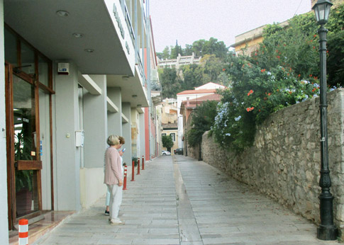 Så var det åter dags att äntra bussen för att ta oss ner från vingården, men nu gick det faktiskt inte som i Strömsö, för nu hade vägarbetarna tagit tag i spad-skaften, det fanns även en massa traktorer, grävmaskiner mm runtomkring. Dessutom hade arbetarna lyckats gräva ett stort hål i marken för att lägga ett dräneringsrör under vägen. Nåväl, chauffören steg ur bussen, för att få fart på gubbarna, därefter steg Nisse ur bussen, gubbarna sade att five” minits”, five “minits”, vet inte hur länge det tog, men efter ett tag var gropen övertäckt med sand och vi kunde köra vidare ganska mycket försenade. Vi beslöt att skippa gamla Korinths ruiner och köra direkt till Loutraki som visade sig vara en relativt stor stad vackert belägen vid havet. Vårt hotell Petit Palais hade ett bra läge vid strandgatan med fin utsikt över havet.