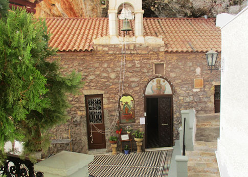 Dag tre tog vi farväl av Nafplio för att starta färden till byn Kiparissi som var resans huvudmål. Vi åkte via Nunneklostret Panagia Elonis som ligger inklämt på en hög klippa (någonstans sägs det att den ligger på 1100 meter) i Kosmas. Resan dit tog litet längre än beräknat på grund av allehanda vägarbeten som gjorde att vi måste ta oss dit via omvägar. Vägen slingrade sig allt högre upp längs vindlande serpentinvägar. Det vackra klostret med hisnande utsikt bebos av endast fyra nunnor och är väl värt ett besök. Utanför Klostrets portar vid parkeringsplatsen sålde två lokala producenter sina produkter, vi inhandlade bla. te, honung, fikon och propolis.
