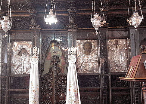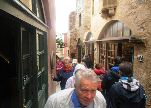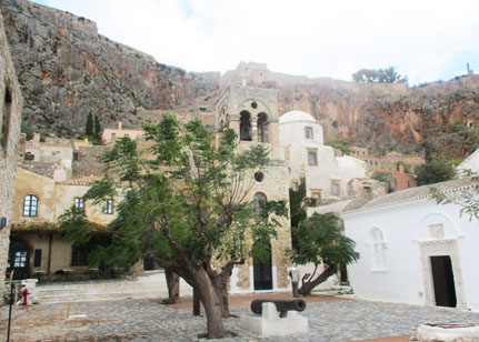 Väl framme vid Monemvasia väntade den lokala guiden och arkelog Effie Anagnopoulou på oss, hon tog oss in i den befästa staden där vi fick höra om stadens historia och speciellt den ortodoxa kyrkan Elkomenos Christos (Den fjättrade Kristus/Kristus i kedjor) som fått sitt namn efter ikonen med samma namn. Vi besökte kyrkan där guiden förklarade närmare om Ikonen som har blivit föremål för vandalism, när en girig handelsman som sålde stulna antikviteter utklädd till präst sågade den i bitar för att lättare kunna ta den ut ur kyrkan. Som tur var hittades ikonen i tid innan den blev såld, men dess öden har varit många även innan denna händelse. Ikonen genomgick en omfattande restaurering och ställdes ut på Atens bysantiska museum. Det tog många år innan den återbördades till kyrkan år 2011 där den förvaras i ett välbevakat litet rum med rätt temperatur och luftfuktighet. Efter att ha vandrat omkring i de gamla smala gränderna kantade med hus från bysantisk tid fortsatte vi till Sparta, där vi besökte olivmuséet som var litet men informativt. Vårt hotell Lakonia i Sparta hade nog en av världens smalaste hissar, två människor rymdes med nöd och näppe in med två smala kappsäckar om man höll andan.