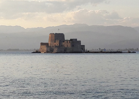 Vår guide lotsade oss genom muséets avdelningar och berättade om föremålen och de olika epokerna och stilarna de representerade. Lunchen intog vi på restaurang Vyzantino, uteserveringen var charmig på ett typiskt grekiskt vis. Efter lunchen satte vi oss i bussen och styrde kosan mot Nafplio, det moderna Greklands första huvudstad (1830 - 1834). Nafplio är en vacker liten stad, med många små mysiga gränder, en plats där man kunde vistas lite längre. Ute i havet i mitten av hamnen ligger det Venetianska fortet Bourtzi byggt 1471 av Antonio Gambello, arkitekt från Bergamo, fortet är specialkonstruerat för att passa in på den trånga smala holmen den står på.