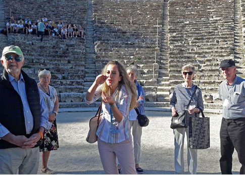 Dag två bevistade vi Epidauros med sin berömda uteteater med platser för 16 000 åskådare och en akustik som får dagens teatrar att blekna i jämförelse, detta utan några som helst tekniska hjälpmedel. Vår guide Vivi Armeni, arkeolog, berättade väldigt entusiastiskt om både teatern och den invid teatern liggande Askleipos helgedom dit folk kom för att få hjälp till sina sjukdomar. Här använde man sig av ett holistiskt tänkande och patienterna botades både psykiskt och fysiskt, teatern hade en stor roll i detta. I Askleipos museums vitriner kunde man se allehanda medicinska instrument, dagens läkare använder sig ännu idag av exakt likadana, endast materialen är andra.