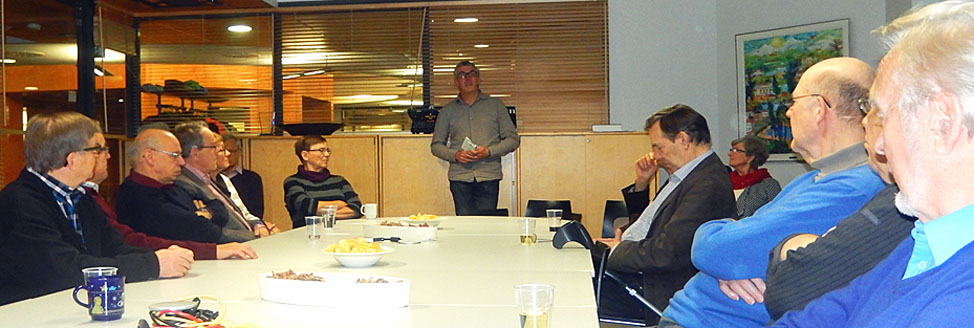 Seniorernas nästsista träff under år 2015 ägde rum i Rubriken på redaktionen den 12 november. Våra gäster var Hufvudstadsbladets chefredaktör Tommy Westerlund, som berättade om de aktuella utmaningarna för Hbl och KSF Media, samt Majsan Stendahl. som har skrivit en bok om journalisten och författaren Gunnar Mattsson. Han var arbetskamrat och god vän med flera av de 16 närvarande seniorerna och utbytet av minnen var givande för bägge parter.